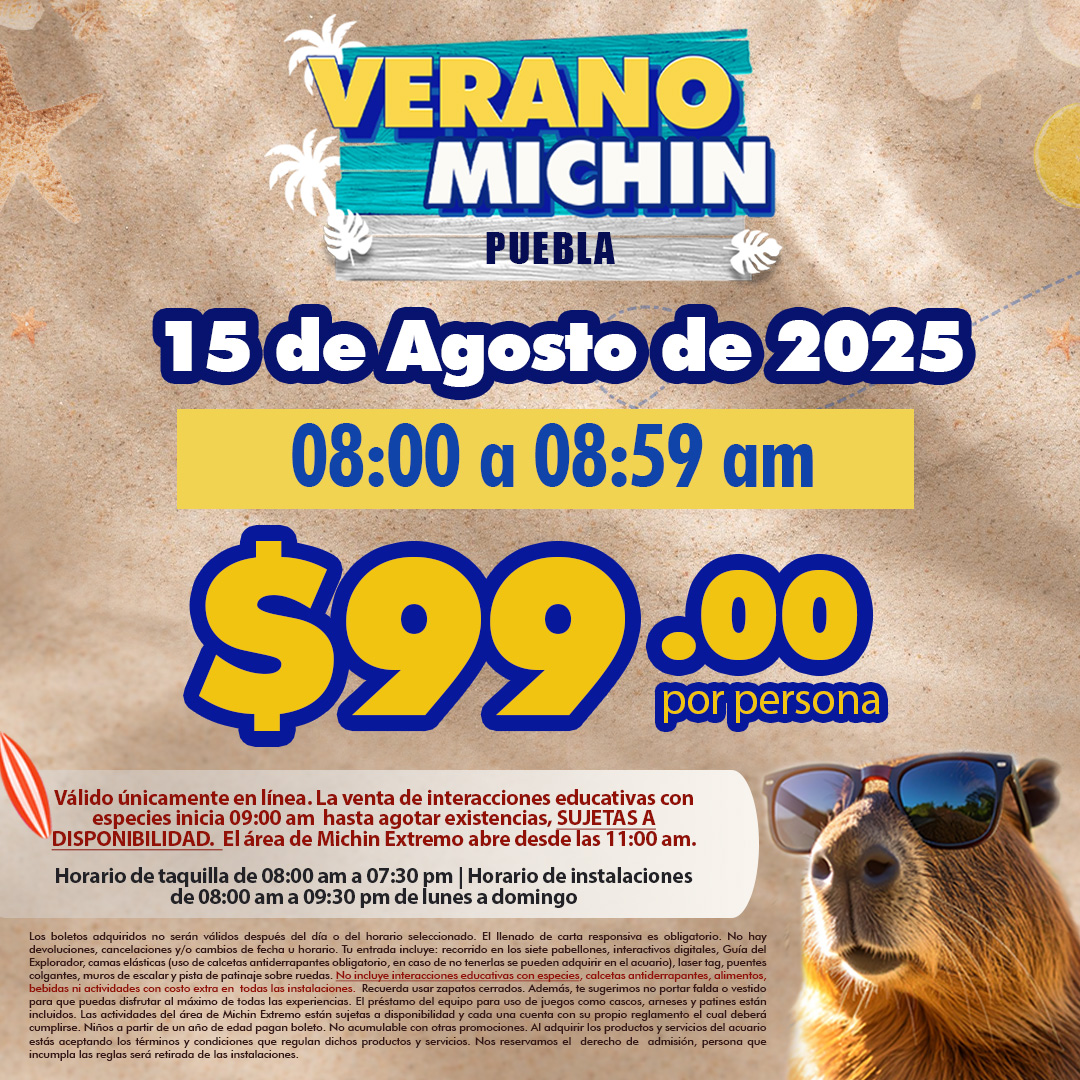 - Los boletos adquiridos con esta promoción sólo son válidos el dia 15 de agosto de 2025 de 08:00 a 08:59 am en ACUARIO MICHIN PUEBLA después de este tiempo pierden válidez.