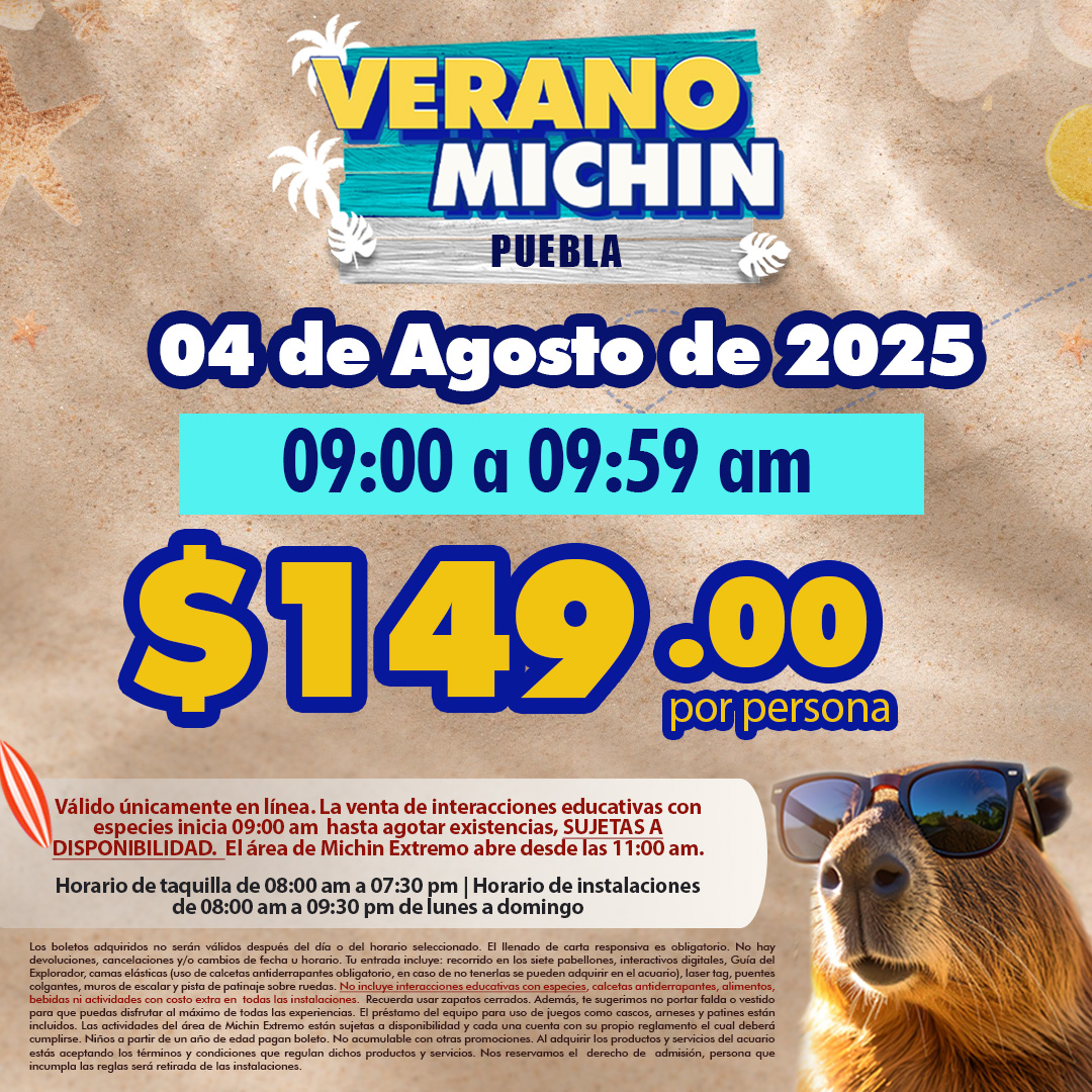 - Los boletos adquiridos con esta promoción sólo son válidos el 04 de agosto de 2025 de 09:00 a 09:59 am en ACUARIO MICHIN PUEBLA después de este tiempo pierden válidez.