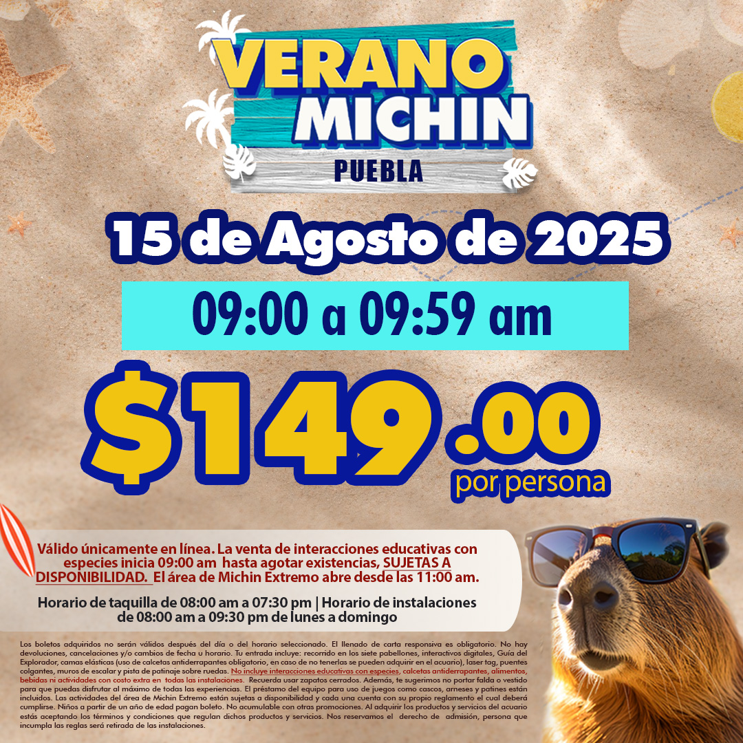 - Los boletos adquiridos con esta promoción sólo son válidos el 15 de agosto de 2025 de 09:00 a 09:59 am en ACUARIO MICHIN PUEBLA después de este tiempo pierden válidez.